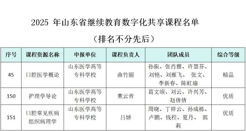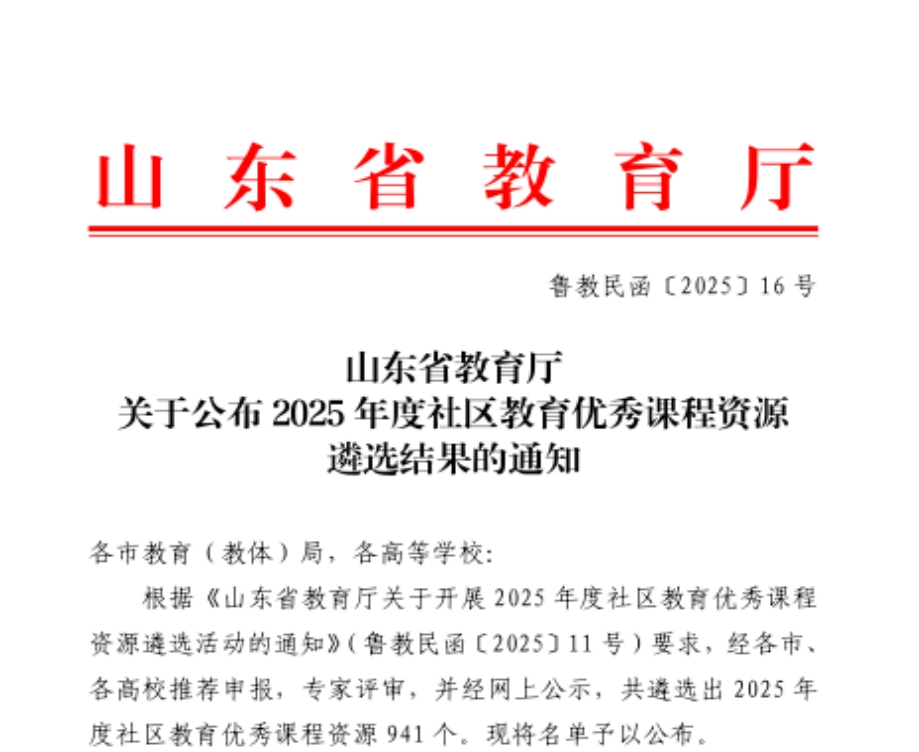 近日,山东省教育厅公布2025年度山东省继续教育数字化共享课程、社区教育优秀课程资源遴选结果。山东医学高等专科学校13门课程成功入选,其中3门获评继续教育数字化共享课程,10门入选社区教育优秀课程资源。